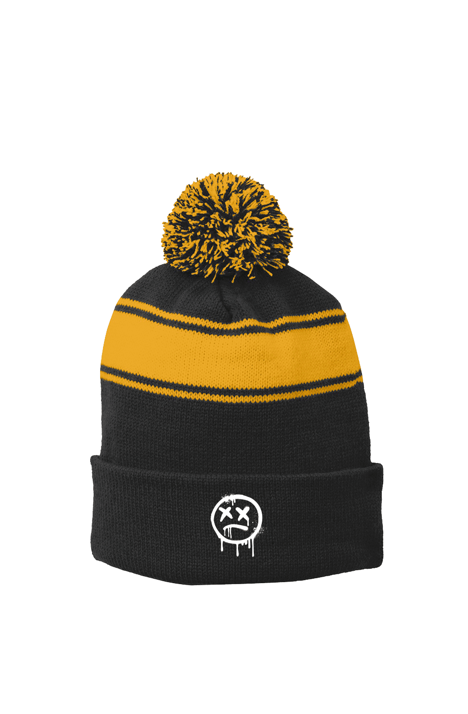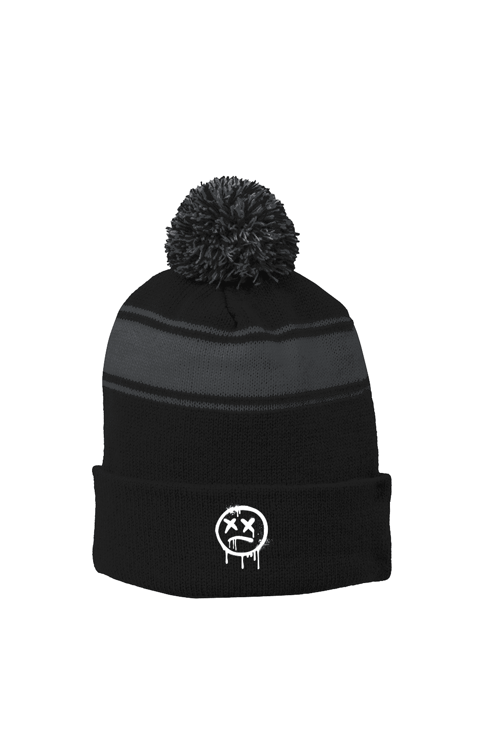 Stripe detail, pom on top, embroidered Happy Face front center.