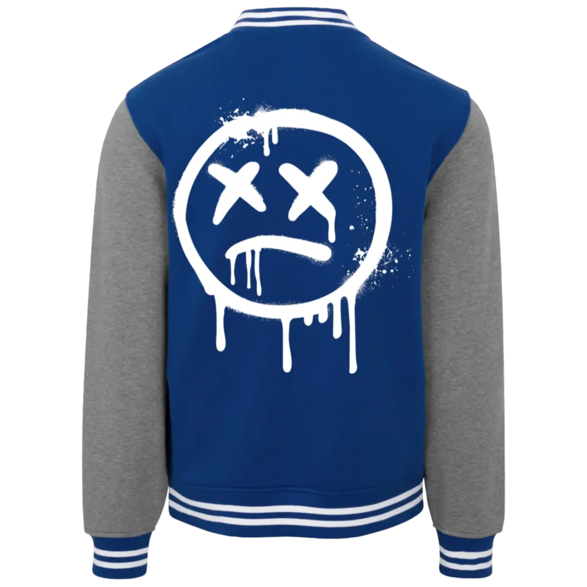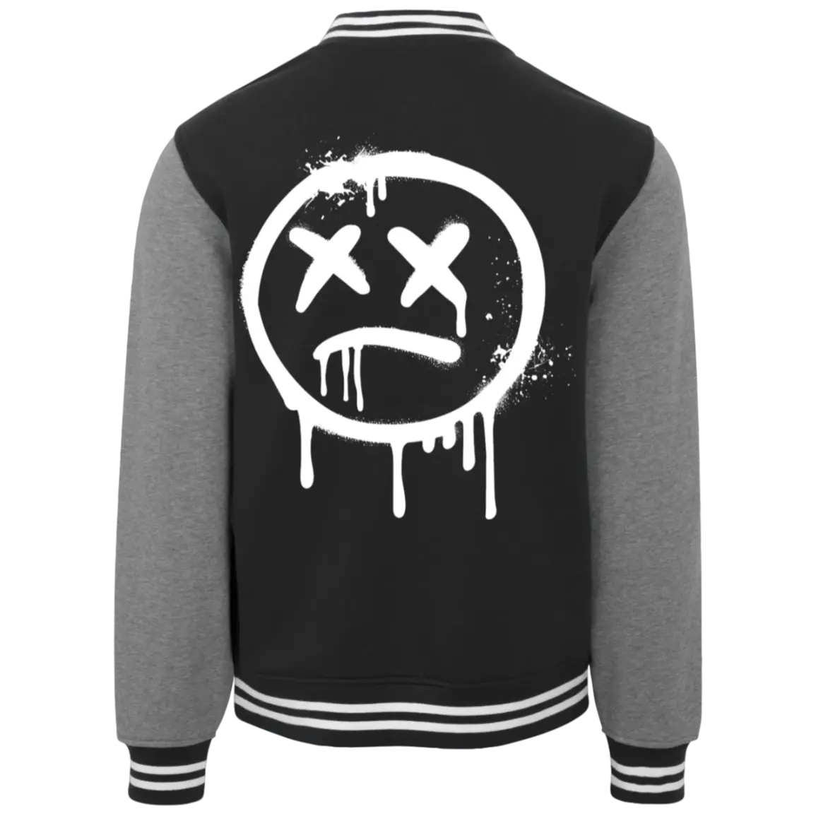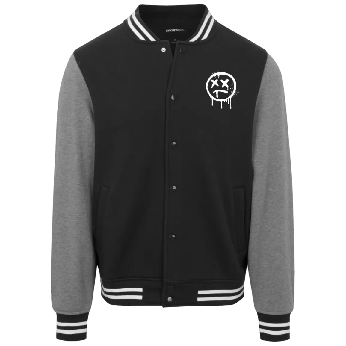 - Happy Face logo — white, left chest and full back